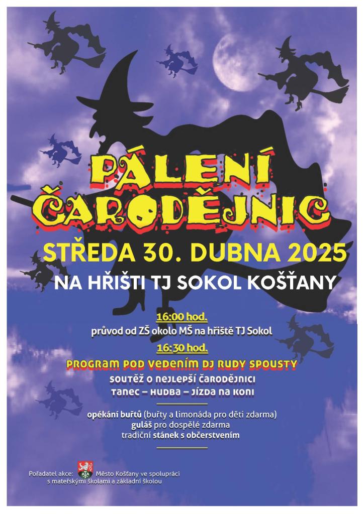 Začátek průvodu je v 16:00 od ZŠ Košťany. V 16:30 průvod dorazí na hřiště TJ Sokol Košťany, kde je připraveno občerstvení - buřty a limonáda pro děti zdarma a pro dospělé je zdarma připraven guláš. Proběhne soutěž o nejhezčí čarodějnici a zapálení ohně, děti se mohou svézt na koni. Programem vás bude provázet DJ Ruda Spousta.